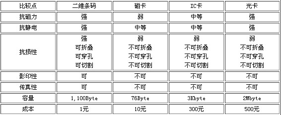 表1:二維條碼同磁卡、IC卡、光卡的比較